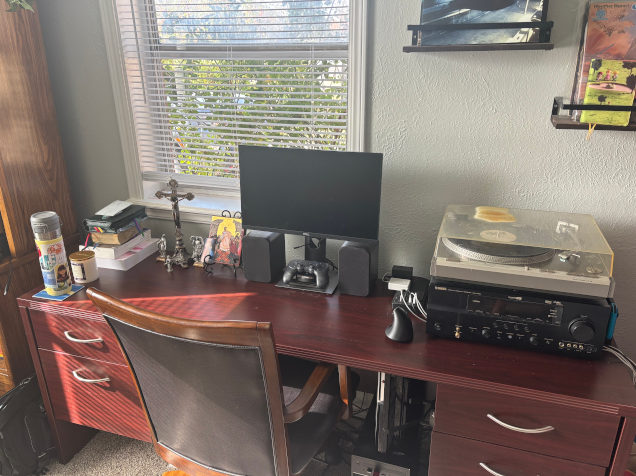 Pictured: my main PC tower, Yamaha stereo, Hitachi vinyl record turntable, Nintendo Switch, fat PS3.