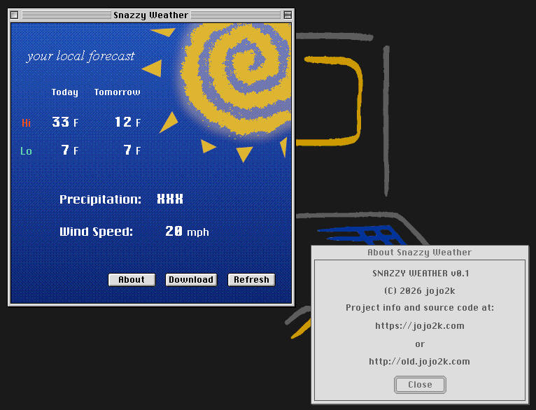 If you want to make your own back-end for this or some other weather program, go check out the NOAA'S weather API. It's very well-documented and free to use for dinky little projects like this. And it's pretty darn easy to interface with - my back-end is just using curl, sed and grep to cut the data down to something super small for this program to download. So all my back-end is is simply a bash script that's set to run every morning to get the day's data from the NOAA API. This program is able to download that data without any HTTPS-related issues due to me hosting this website over HTTP also (http://old.jojo2k.com), so this program works with very little fuss on older machines.